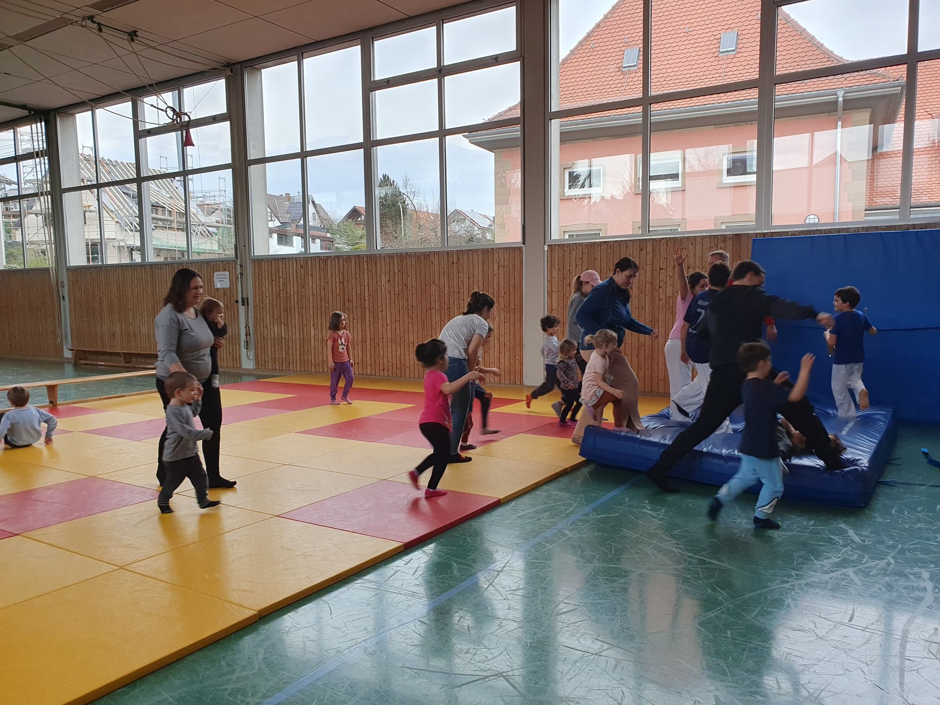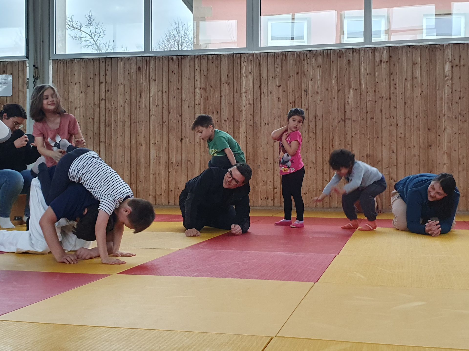 Eltern oder auch Großeltern sind zusammen mit den Kleinen auf der Matte herzlich willkommen. In spielerischer Form wird gelaufen, gesprungen und gehüpft. Aber auch das Ringen und Raufen (mit oder ohne Judo-Technik) kommt nicht zu kurz. Bei (fast) allen Übungen sind die Kinder mit ihren Eltern/Großeltern auf der Tatami (Judomatte).